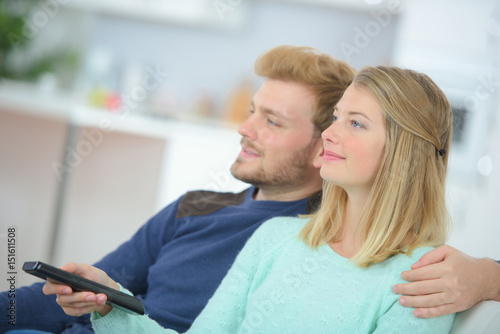 Obraz premium Embracing couple using remote control