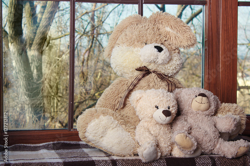 © KsPhoto, Obraz premium embracing loving teddy bears toys sitting on window-sill