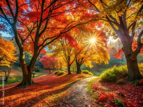 © Arnada, Naklejka premium Embracing the Colorful Autumnal Magic: A Candid Capture of Nature's Splendor and Vibrant Foliage in a Tranquil Forest Setting