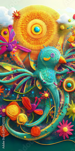© drsult, Fototapeta premium Embroidered art scene featuring a bird, sun, flowers, and dragonfly.