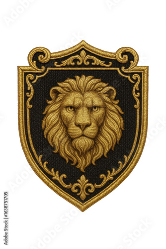 © MDNANNU, Fototapeta premium Embroidered Golden Lion Head Emblem with Ornate Scrollwork on Textured Dark Background