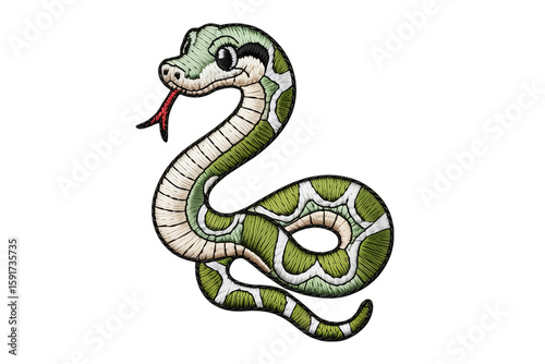 © Cinco, Fototapeta premium Embroidered green snake with red tongue white