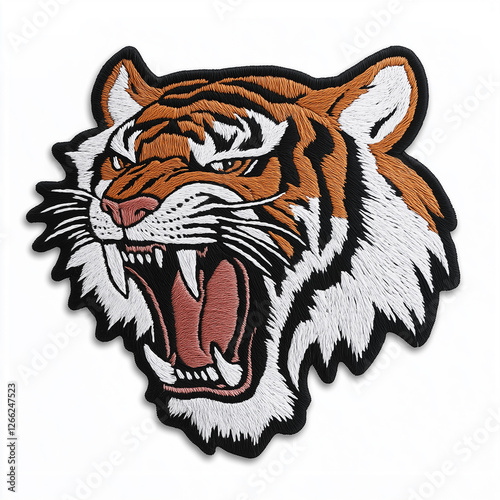 Fototapeta premium Embroidered growling tiger head patch on white background