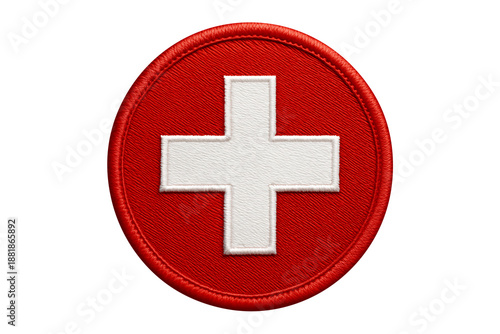 Fototapeta premium Embroidered swiss flag circular patch isolated on transparent background