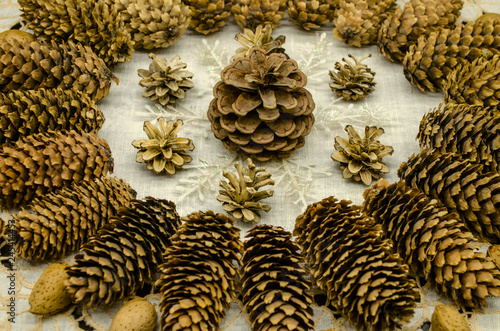 Fototapeta premium Embroidered white wavy napkin with a pattern of cones of different breeds,...