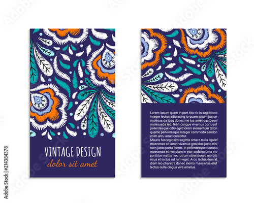 Obraz premium Embroidery style flyer with bright colorful flower and leaf pattern. Ethnic ornamental blanks. Rustic design brochures inspired by russian khokhloma ornament. EPS 10 vector. Clipping masks