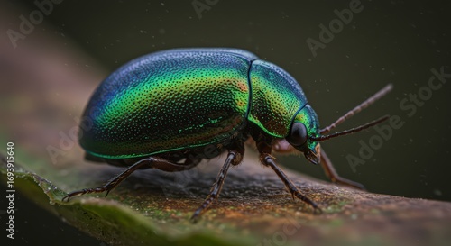 © widiati, Fototapeta premium Emerald beetle on leaf closeup
