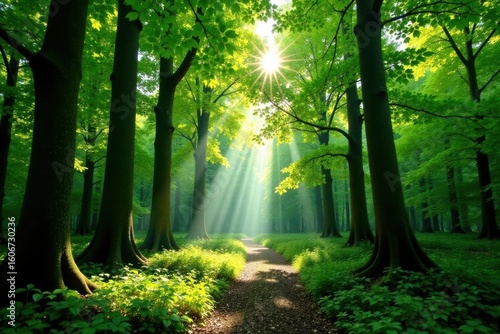 © Montip, Fototapeta premium Emerald canopy, Loch Lomond forest Summer sunlight dapples leaves , Loch Lomond, fresh, forest