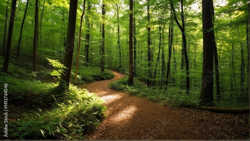 Obraz premium Emerald Canopy Path: A Winding Trail Through Lush Green Woods Bathed in...