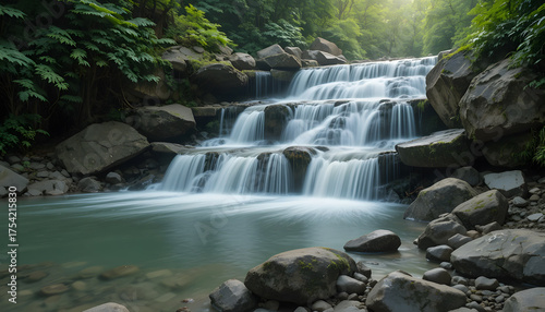 © Samina, Fototapeta premium Emerald Cascade: Long Exposure of a Tranquil Forest Waterfall