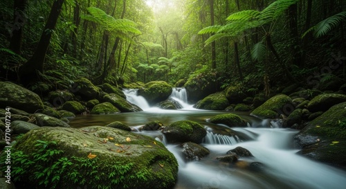 © muhammad, Obraz premium Emerald Cascade: Mossy Rocks and Ferns in a Lush Rainforest Stream