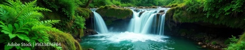 Fototapeta premium Emerald cascades tumble over mossy rocks, ferns unfurl , water, forest, stream