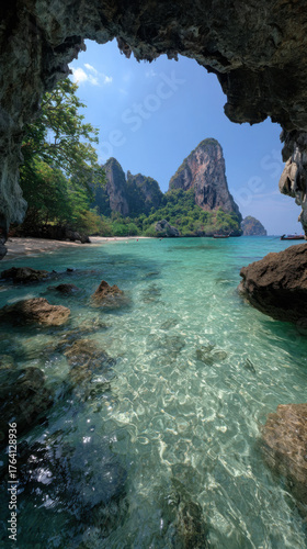 Naklejka premium Emerald Cove Sanctuary: A breathtaking coastal scene frames a turquoise ocean, embraced by a limestone rock formation creating a captivating, tranquil, and picturesque scenery.