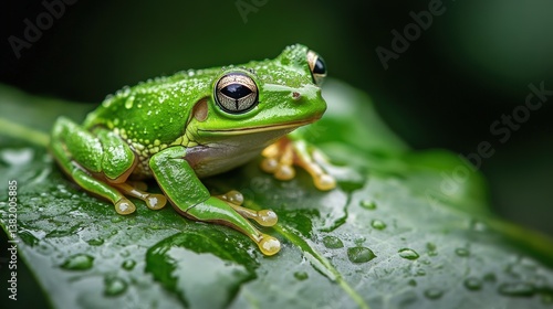 © Nitiporn, Naklejka premium Emerald Eye: A vibrant green tree frog with prominent golden eyes, perched on a glistening dew-laden leaf, a captivating image of nature's artistry.