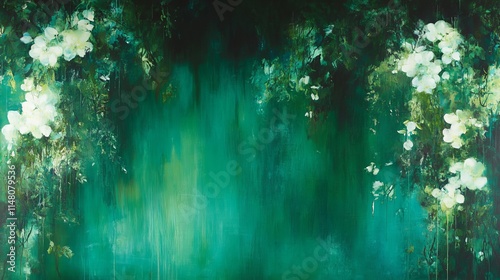© Big9869, Fototapeta premium Emerald Garden White Blossoms Cascading Down a Teal Wall