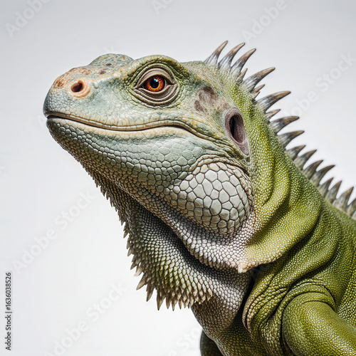 © EDRHIM, Fototapeta premium Emerald Gaze of the Iguana: The captivating gaze of a vibrant green iguana against a soft backdrop, revealing intricate details and textures, portraying its unique beauty in sharp focus.