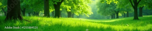 Obraz premium Emerald grass sways under the branches of towering trees, landscape, soft...
