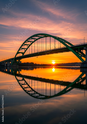 Naklejka premium Emerald Green Arch Bridge Over Calm Water at Sunset
