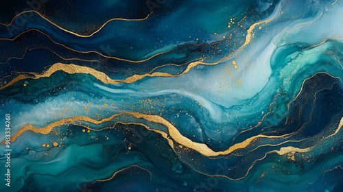 © Mystikal Forest, Fototapeta premium Emerald green, blue and gold abstract marble texture for luxury interior design and digital art backgrounds