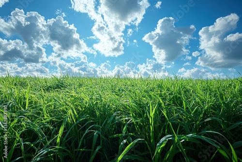 Obraz premium Emerald Green Grass Stretches Under a Bright Blue Sky Adorned With Fluffy...