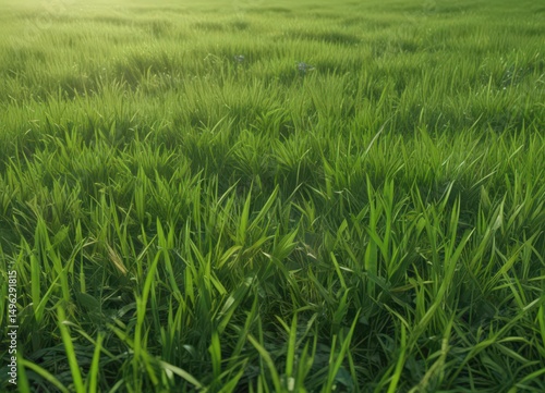 Obraz premium Emerald green grassy field, sunlit blades of grass, organic, spring, meadow