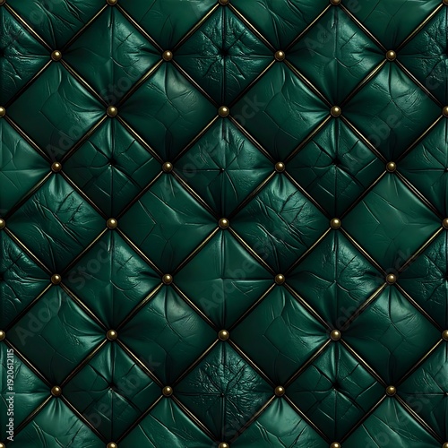 © Cintaiaku, Fototapeta premium Emerald green leather, diamond-patterned upholstery with gold studs