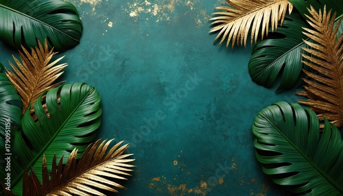 © Maryna, Fototapeta premium Emerald green monstera and golden palm leaves arranged on dark teal textured backdrop with gold flecks. Lush foliage offers natural elegant design element.
