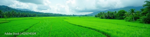 © Temteen, Obraz premium Emerald green rice paddies under overcast sky, nature, bali, tropical