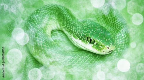 Obraz premium Emerald Green Snake Coiled, Bokeh Background