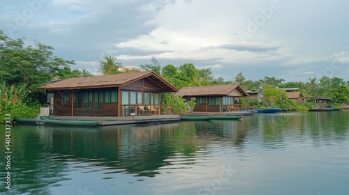 © Pannee, Fototapeta premium Emerald green water reflecting cloudy sky and rustic floating cabins