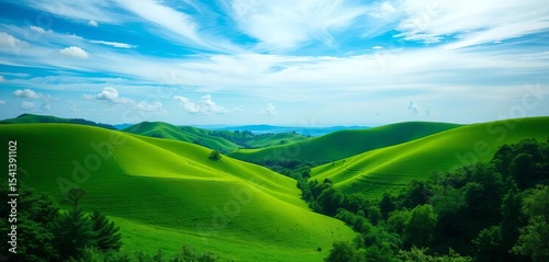 © สาวิตรี ตนกิจ, Obraz premium Emerald hills rolling under a vibrant green sky, sun-dappled forest floor, trees, untamed