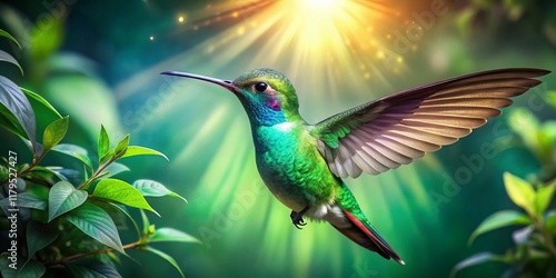 © prapatsorn, Obraz premium Emerald Hummingbird Dream: Surreal Green Flight Photography