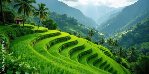 Obraz premium Emerald rice terraces cascade down, lush jungle backdrop, palm trees sway , irrigation, landscape