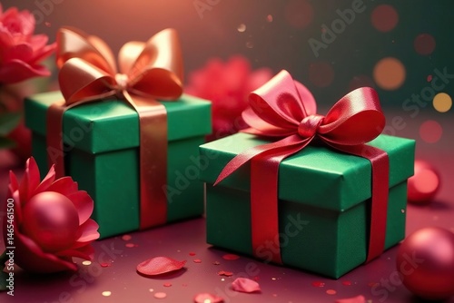 Obraz premium Emerald & ruby gift boxes, large bows, ethereal scene, whimsical, smooth
