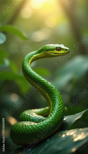 © vadosloginov, Obraz premium Emerald Serpent: A Vivid Green Snake Amidst Lush Foliage in a Sun-Kissed Jungle Setting