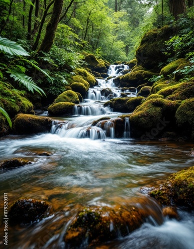 Obraz premium Emerald Stream Flowing Through a Verdant Forest Cascade