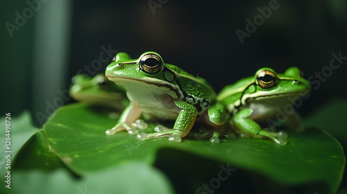 Naklejka premium Emerald Symphony Three Frogs Harmonizing on a Green Leaf Pad Enchanting Nature Scene Photography