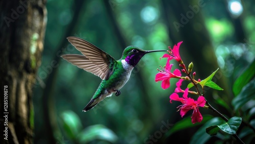 © TheWaterMeloonProjec, Fototapeta premium Emerald Violet-ear, Colibri thalassinus, hovering in lush tropical woodland, red flowers, Tapanti NP, Costa Rica. Jungle wildlife scene featuring a hummingbird near pink blossoms in a forest habitat.