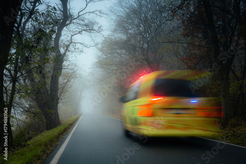 © Chalabala, Fototapeta premium Emergency ambulance speeding on road in heavy fog on gloomy autumn day. Motion blur conveying urgency, danger and rapid response of medical rescue services in poor visibility conditions.
