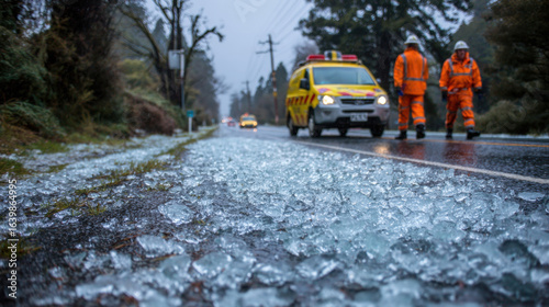 © Katerina, Obraz premium Emergency crew in orange suits clear hail-covered road after severe storm