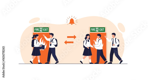 Naklejka premium Emergency Evacuation Drill In School Building With Students And Teachers