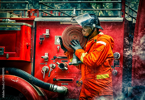 Naklejka premium Emergency Fire Rescue training, firefighters in uniform, carry a water hose...