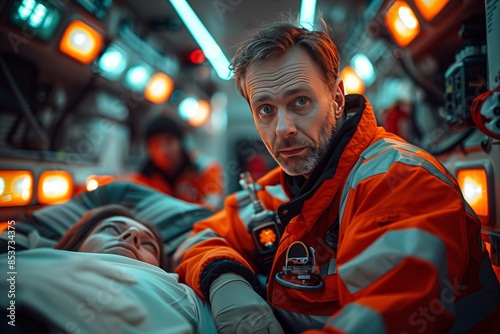 Fototapeta premium Emergency Medical Services: Paramedic in Ambulance