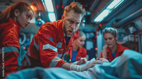 © saichon, Obraz premium Emergency medical technicians (EMTs) are intently providing life-saving procedures to a patient in the back of an ambulance.
