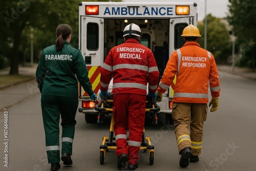 Obraz premium Emergency Response: A dedicated team of paramedics, emergency medical staff,...