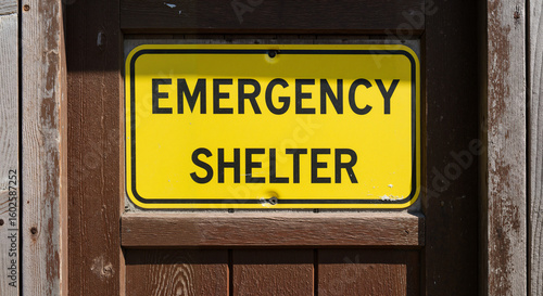 © Nadezhda, Fototapeta premium Emergency shelter sign displayed on wooden door in outdoor setting