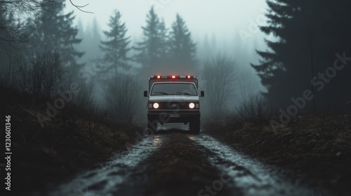 Obraz premium Emergency vehicle drives on foggy forest road.