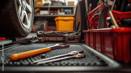 Fototapeta premium Emergency Vehicle Tools Kit with Wheel Spanner and Spade displayed in Car Interior Organizer - Preparedness for Automotive Breakdowns