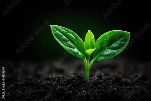 Naklejka premium Emerging plant sprout in rich dark soil.