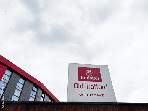 © AS Photo Family, Obraz premium Emirates Old Trafford sign in Manchester welcoming visitors to the stadium